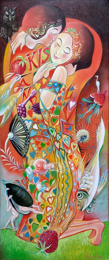 Liefde tussen man en vrouw was de inspiratiebron voor dit schilderij. In deze tijd, die overspoeld lijkt te worden door oorlog en geweld, is verdraagzaamheid, respect en liefde voor elkaar zo belangrijk. Het is geschilderd met olieverf op linnen, met een knipoog naar Jeroen Bosch.