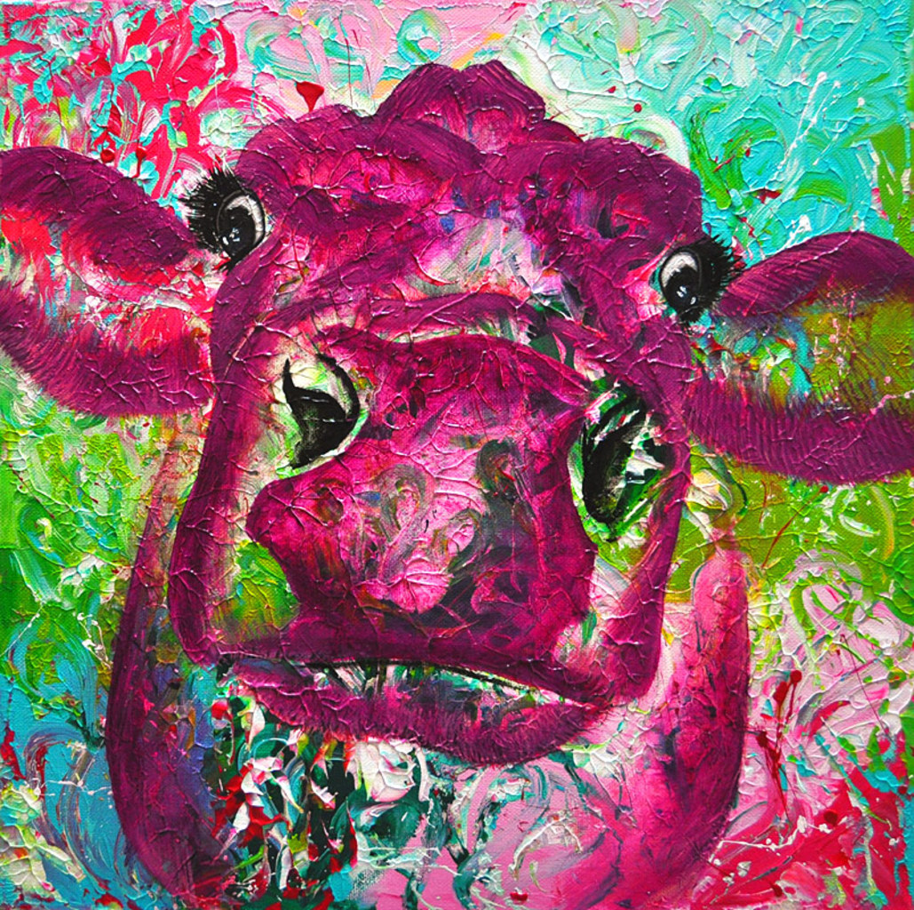 VERKOCHT. Kleurrijk koeienschilderij. Achtergrond acrylverf en de koe in olieverf. 50x50x4cm.