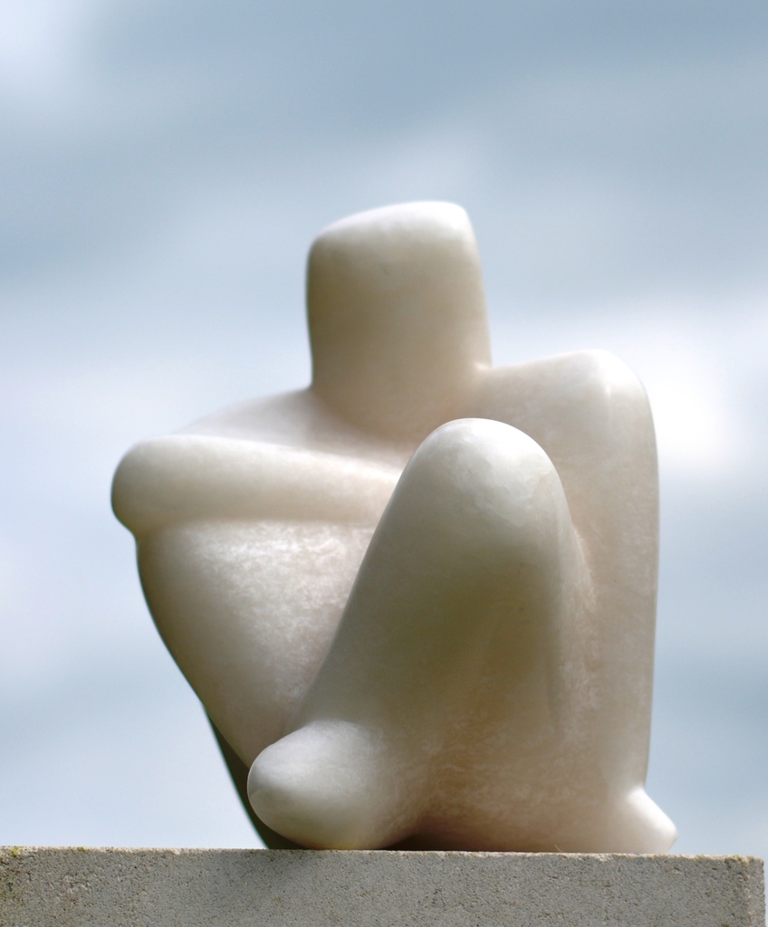 Een beeld van witte albast. De albast is wit en enigzins doorschijnend. Afwisselend ronde en hoekige vormen. VERKOCHT