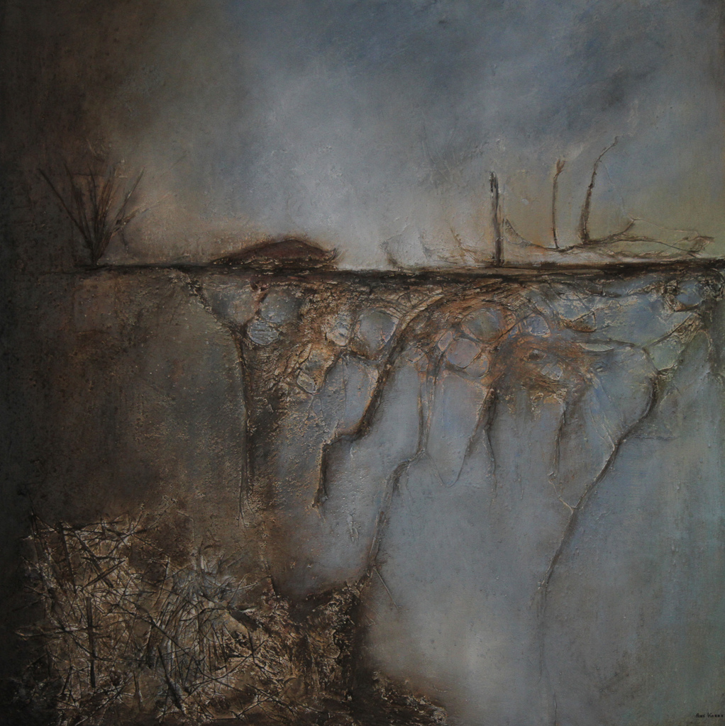 acryl op doek, 100x100 Zand. boombast,riet etc.