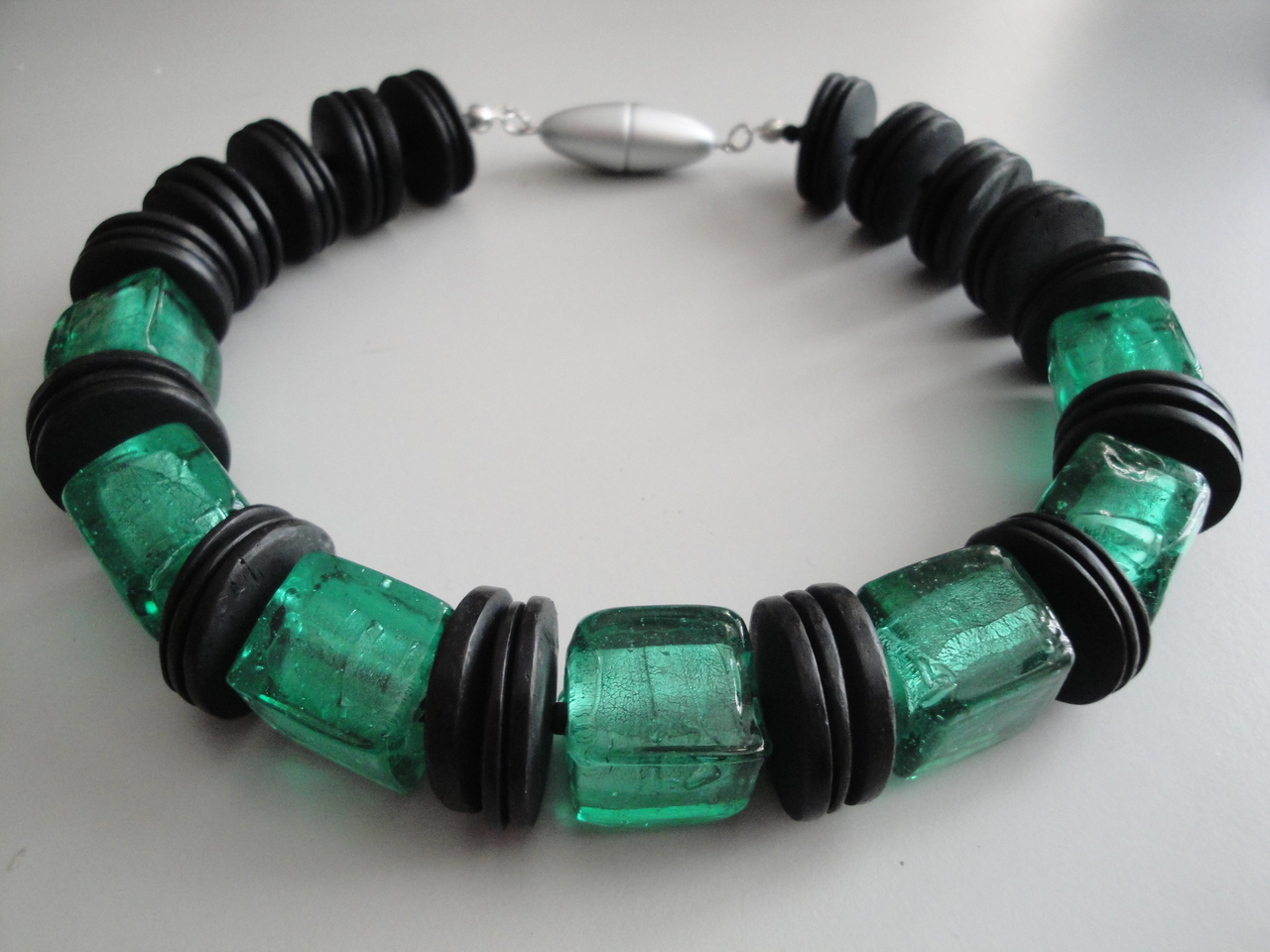 smaragdgroene glaskralen (2x2cm), zwarte schijfjes van cocosnootbast; zilverkleurig magneetslot; centrumlengte ongeveer 46 cm; gewicht ongeveer 225 gr.