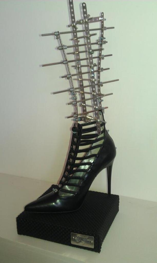 Sculptuur gemaakt van meccano gebaseerd op een damesschoen.