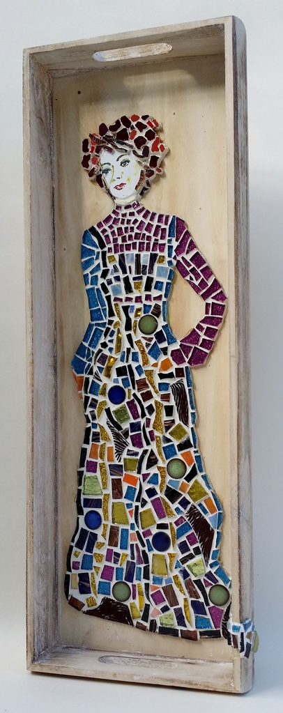 Ik heb me laten inspireren door de vrouwenportretten van Gustav Klimt en heb een vrouw gemaakt met glas- en tegel mozaïek in een houten bak. Het gezicht heb ik geschilderd op tegel en in het schilderij verwerkt. Detail: De onderkant van de jurk loopt door op de zijkant van de bak. Dit werk is verkocht bij mijn expositie tijdens de Kunst10daagse in Bergen (N.H.)