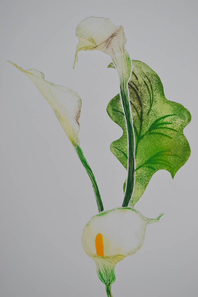 Calla - droge naald en aquatint - uitgezaagde zinkplaatjes - meerkleuren druk - oplage 1/1