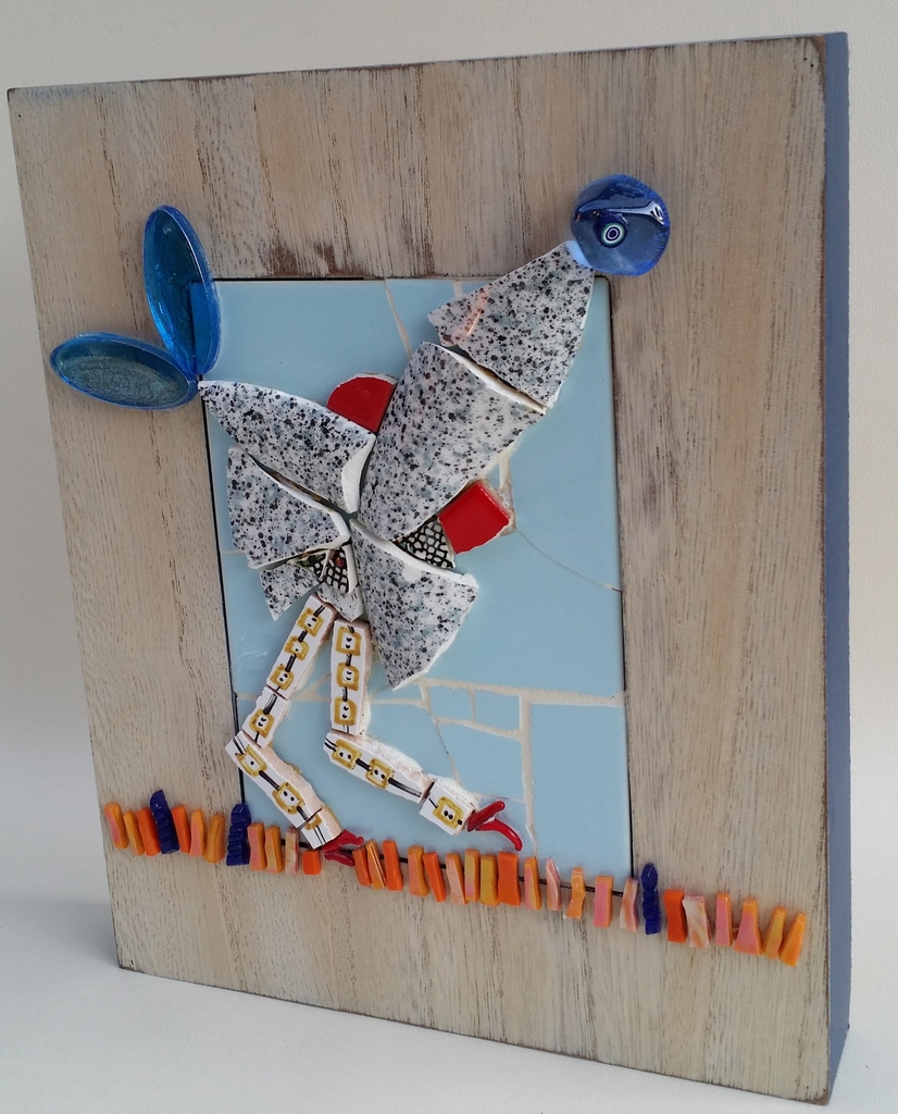 Een "vreemde vogel" gemaakt van glas en keramische tegel op hout. Kan zowel staan als hangen en de zijkanten zijn blauw geschilderd en gelakt. Dit werk is verkocht in de winkel van "de Kunstkerk" in Heerhugowaard.