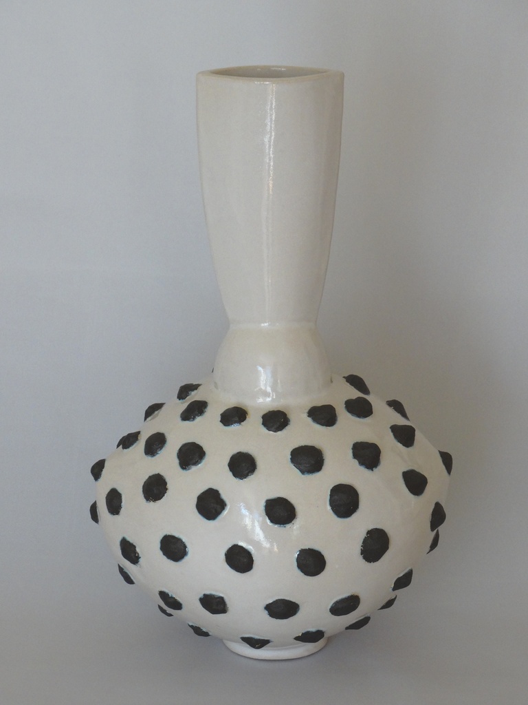 Samengestelde vaasvorm, basis ovaal. Wit geglazuurd, opliggende zwarte stippen, aardewerk.