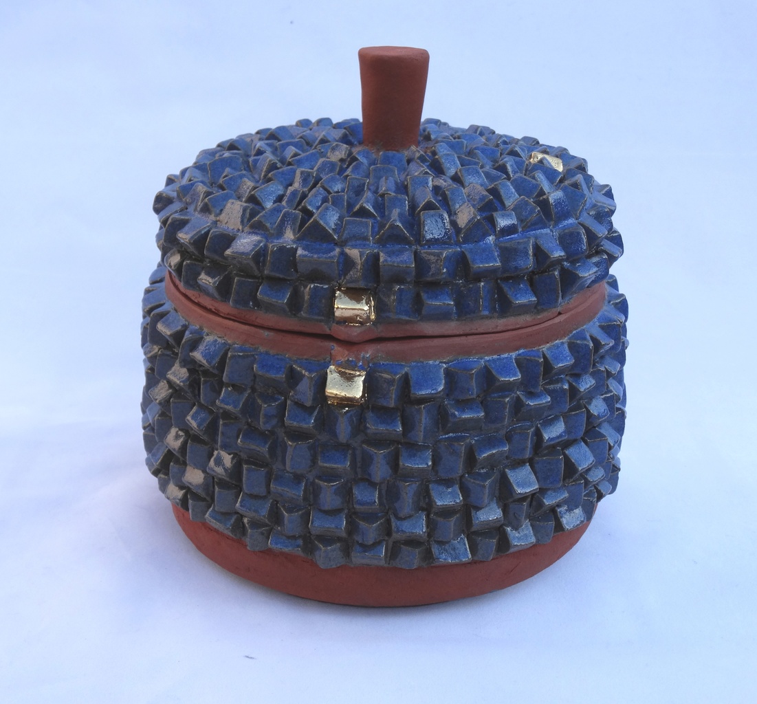 Dekseldoos van roodbakkende klei. gedecoreerd met opliggende blokjes. Blauw geglazuurd aardewerk met gouden accenten.