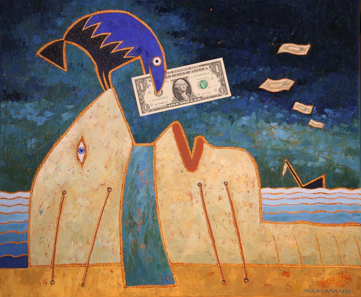 Verslaving (begeerte) is een van de zonden bij Jeroen Bosch. Die verslaving heb ik uitgebeeld met de Amerikaanse dollar