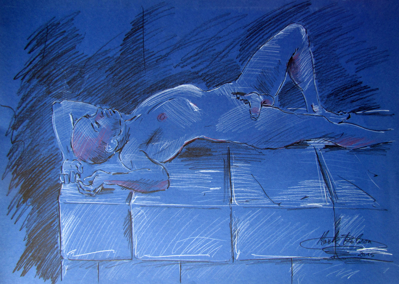 Een mannelijk naakt ligt op een voorwerelds altaar. - Pastelpotlood op Cansonpapier