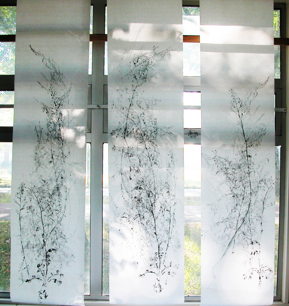 Een lange baan rijstpapier is aan twee kanten bedrukt met wilde planten. Het rijstpapier is enigszins transparant, waardoor de bedrukking diepte krijgt.