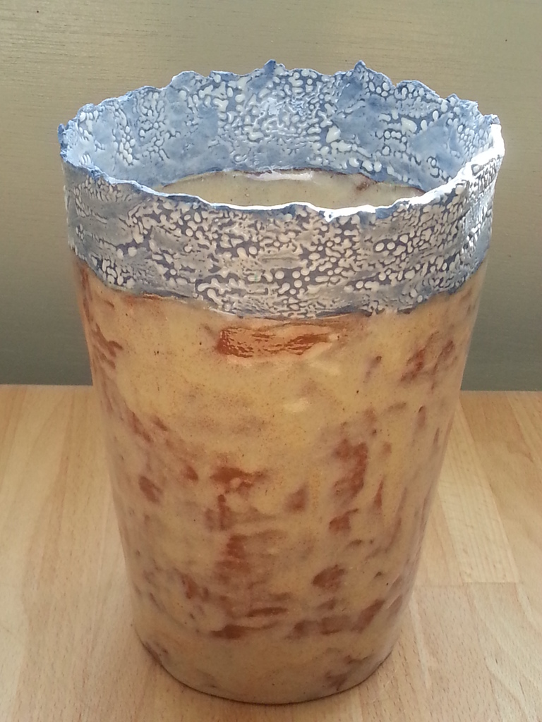 vaas van steengoed, beige/bruin, met rand van blauw gekleurd porselein met wit bobbelig glazuur
