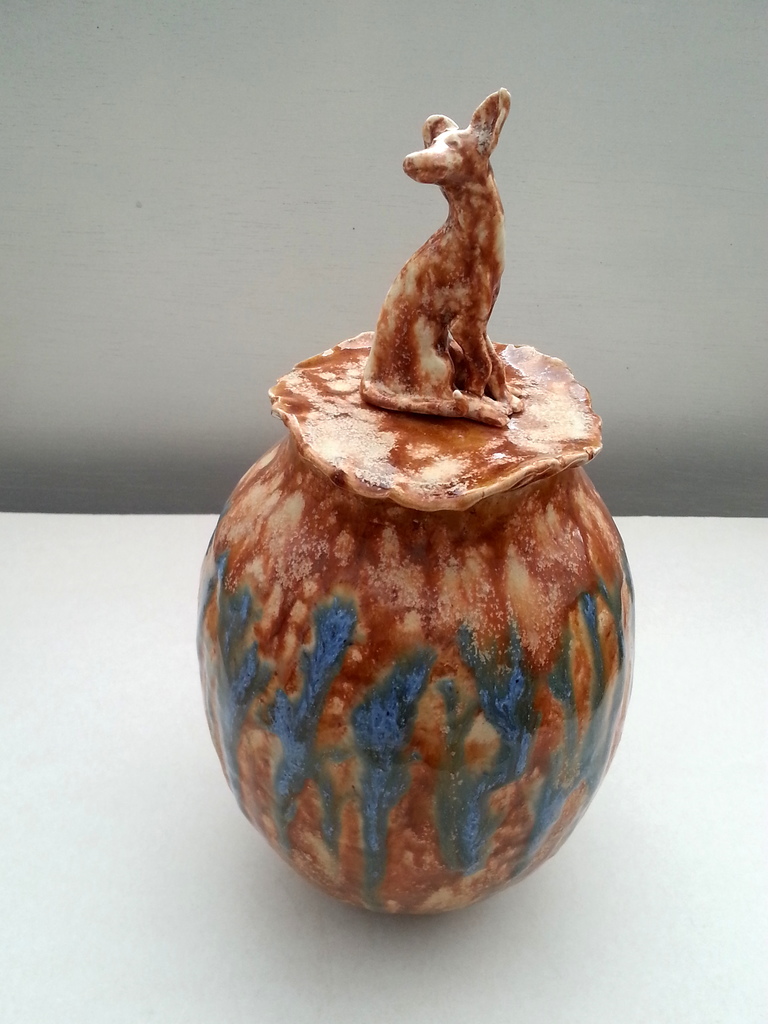 hoge bedekte vaasl van steengoed, met daarop een hond van porselein, honing en blauw gekleurd