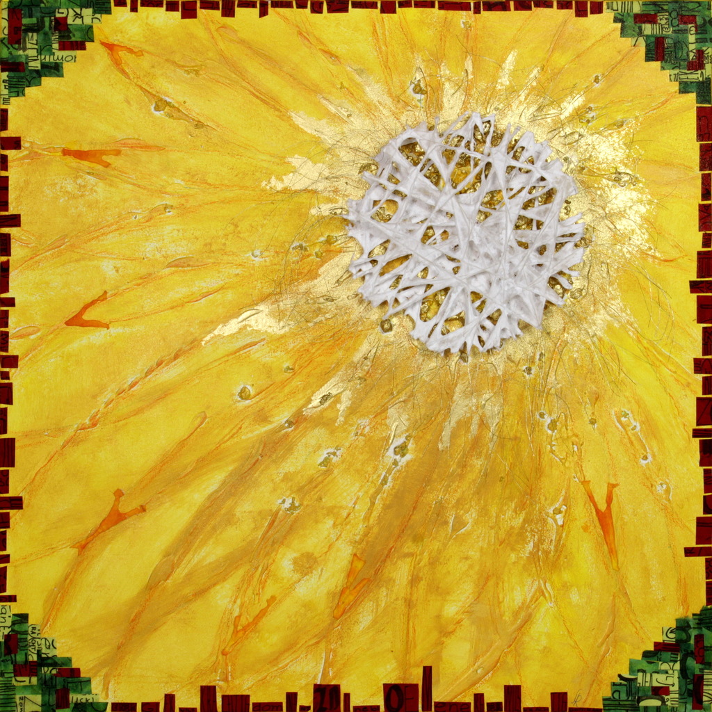 Geschilderd met acryl en collage van handgeschept papier en kalligrafie
