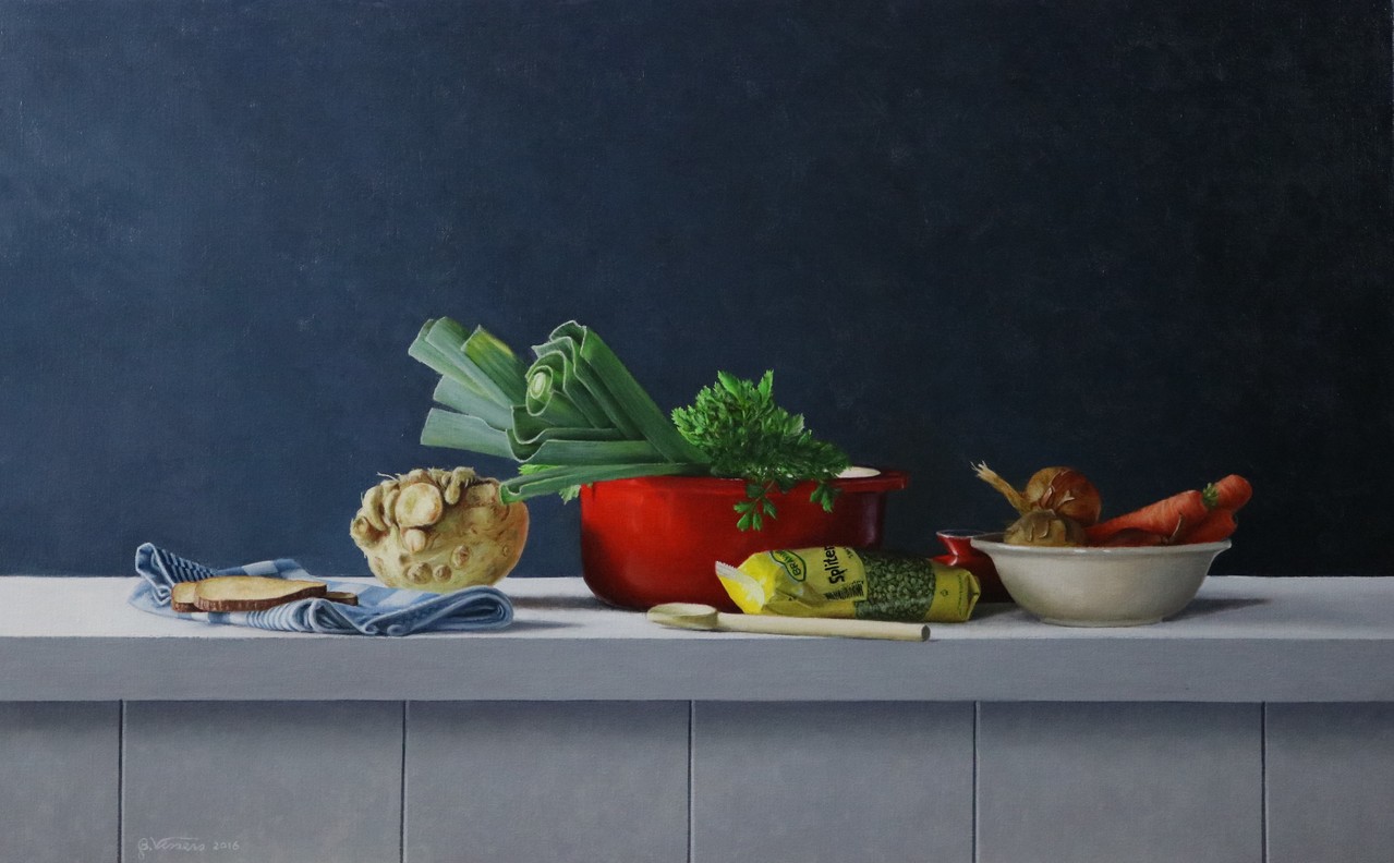 Schilderij Realistisch Stilleven Wortels Vissers Ui Theedoek Uien Kunstschilder Wortel Erwtensoep Pollepel Bert Prei Wortelen Koolrabi Bertvissers Brandwijk Spliterwten