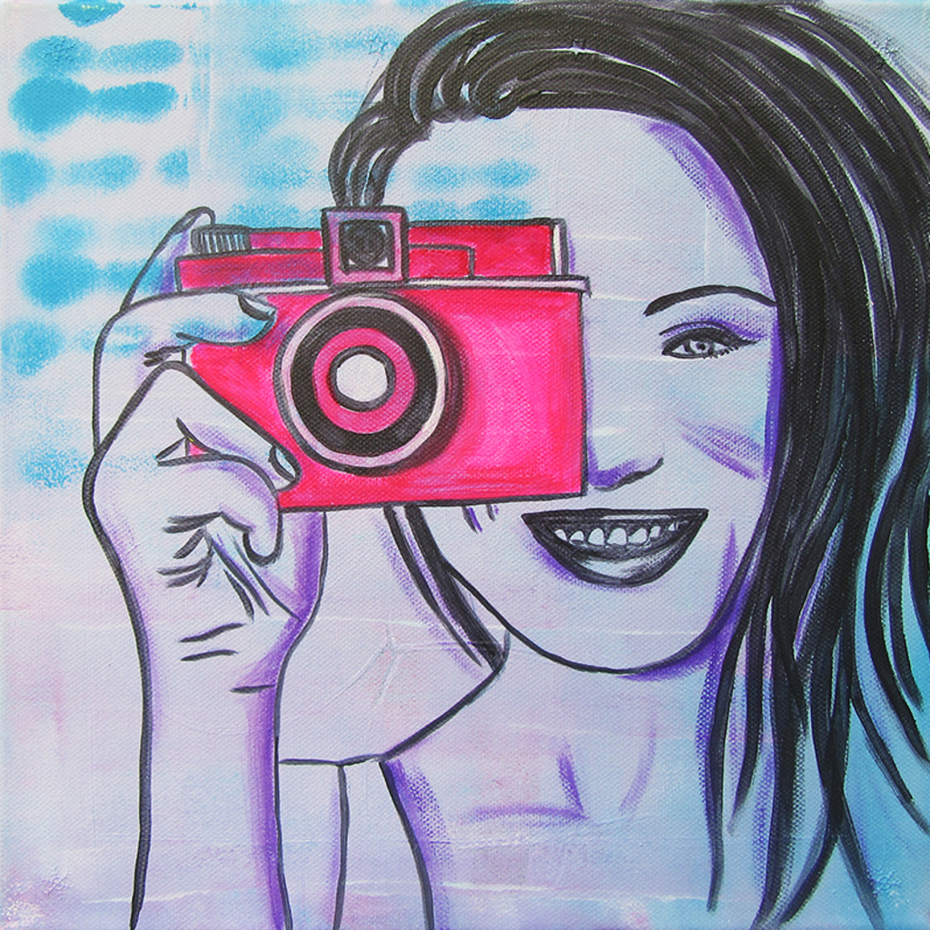 Schilderij voor de tienerkamer van een vrolijke meid met roze fototoestel. Het schilderij is handgeschilderd met acrylverf en bewerkt met graffiti.