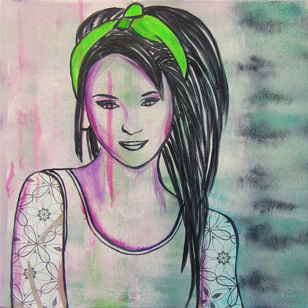 Schilderij voor de tienerkamer van een stoere meid met groene haarband en tatoeages. Het schilderij is handgeschilderd met acrylverf en bewerkt met graffiti.