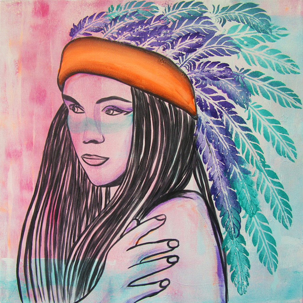 Stoer schilderij voor op de tienerkamer van een Indiaan met Veren. Het schilderij is handgeschilderd met acrylverf en bewerkt met graffiti.