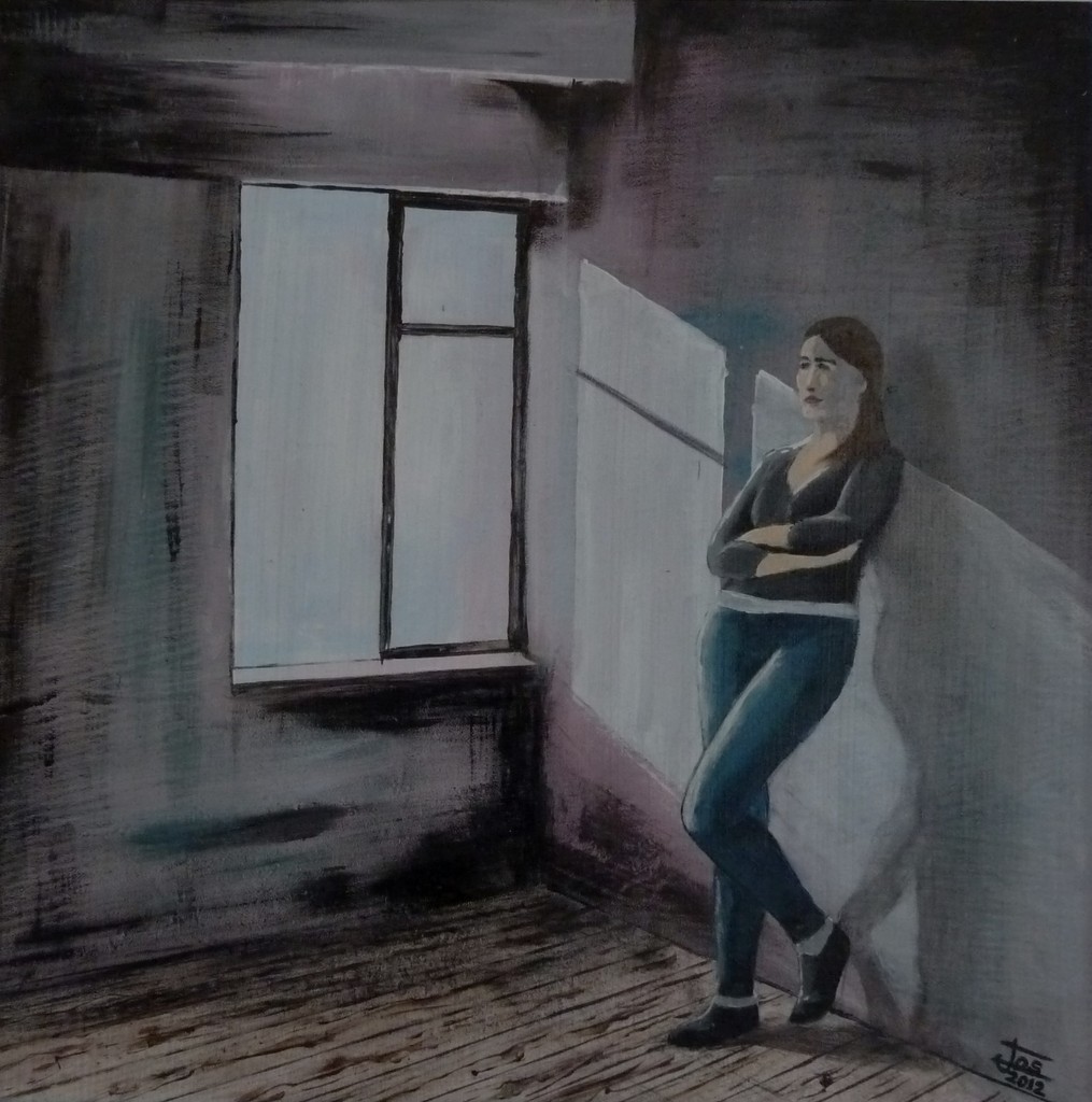 Waar zou de vrouw aan denken? Bekijkt ze iets dat zich links buiten beeld bevind? Denkt ze na over hoe van deze schimmelige kamer nog iets te maken? Of overdenkt ze haar relatie? Wordt geleverd met passepartout en lijst. Geheel is ongeveer 50x50 cm.