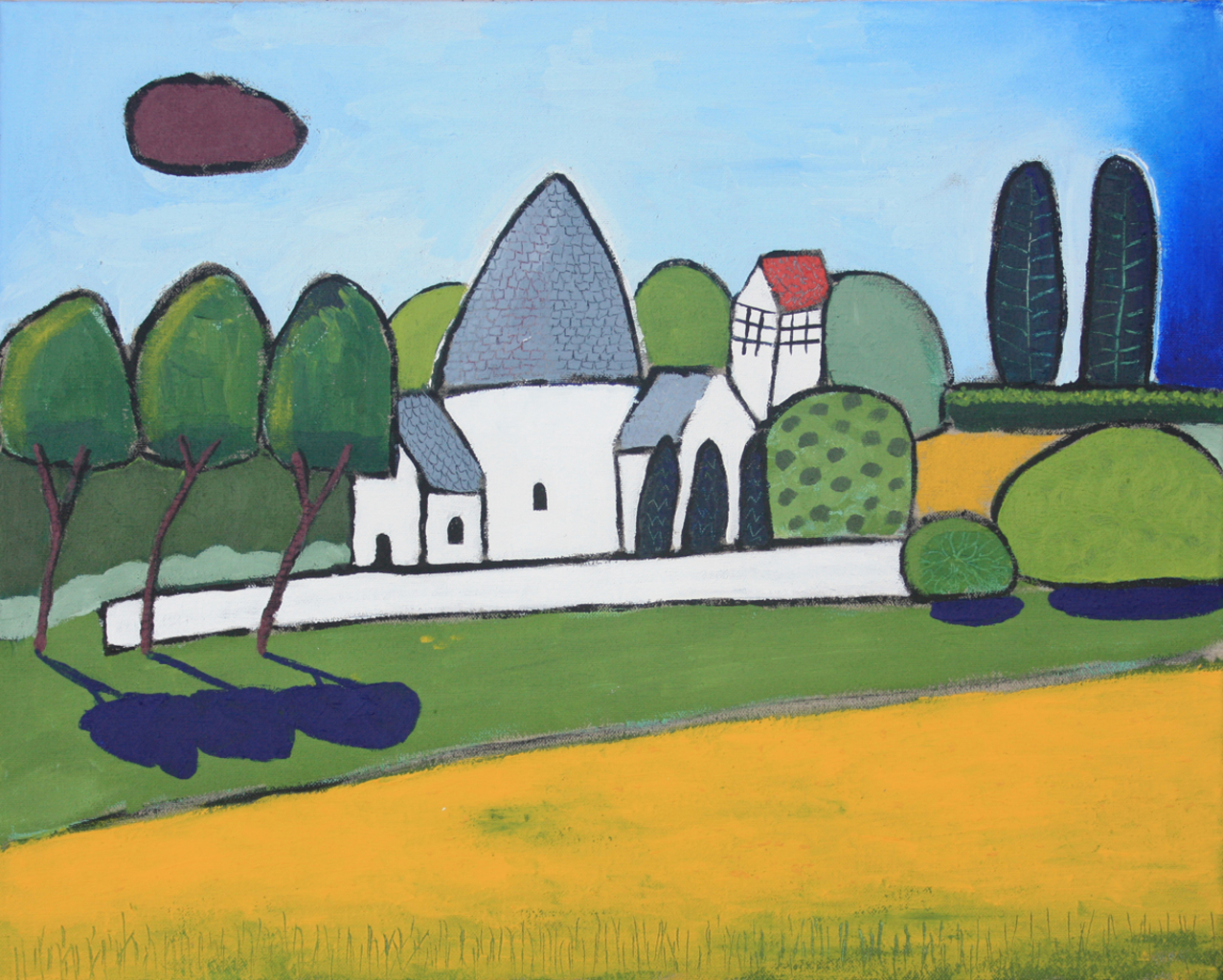 Schilderij Landschap Art Kunst Painting Expressionist Landscape Kerk Church Europe Trees Denemarken Koolzaad Velden Country Round Denmark Kirche Danmark Gemalde Konst Bornholm Denemark Rundkirke