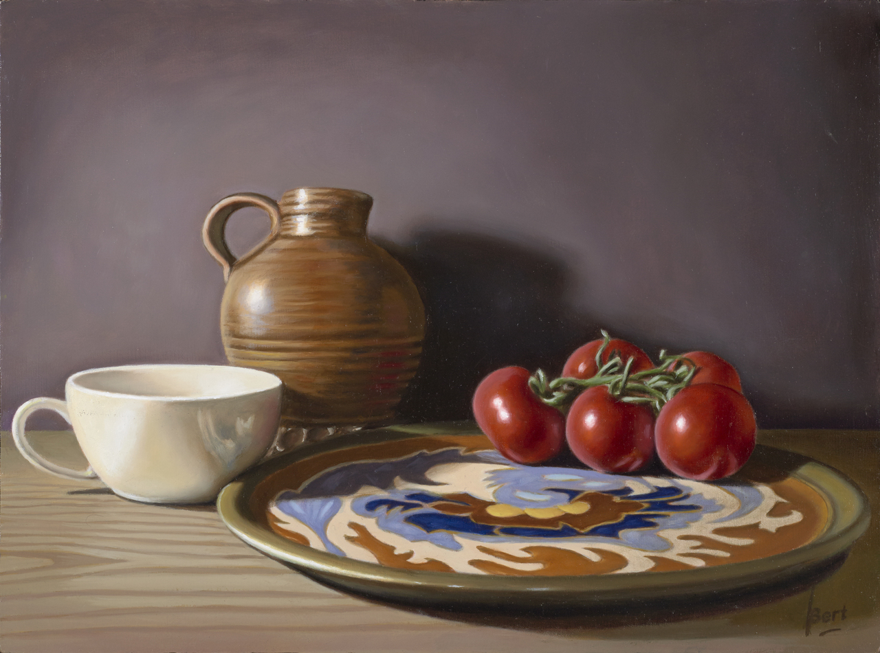In dit stilleven heb ik een oude schaal van plateel, een kopje en een oude vaas gecombineerd met moderne trostomaten.