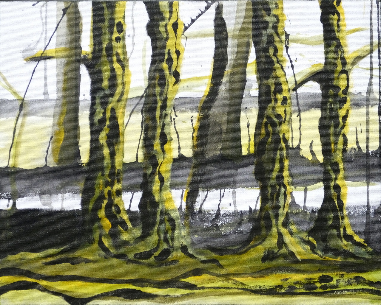 Bomen op hardboard (24x30cm) op donkergroen hardhouten paneel 50x52cm).