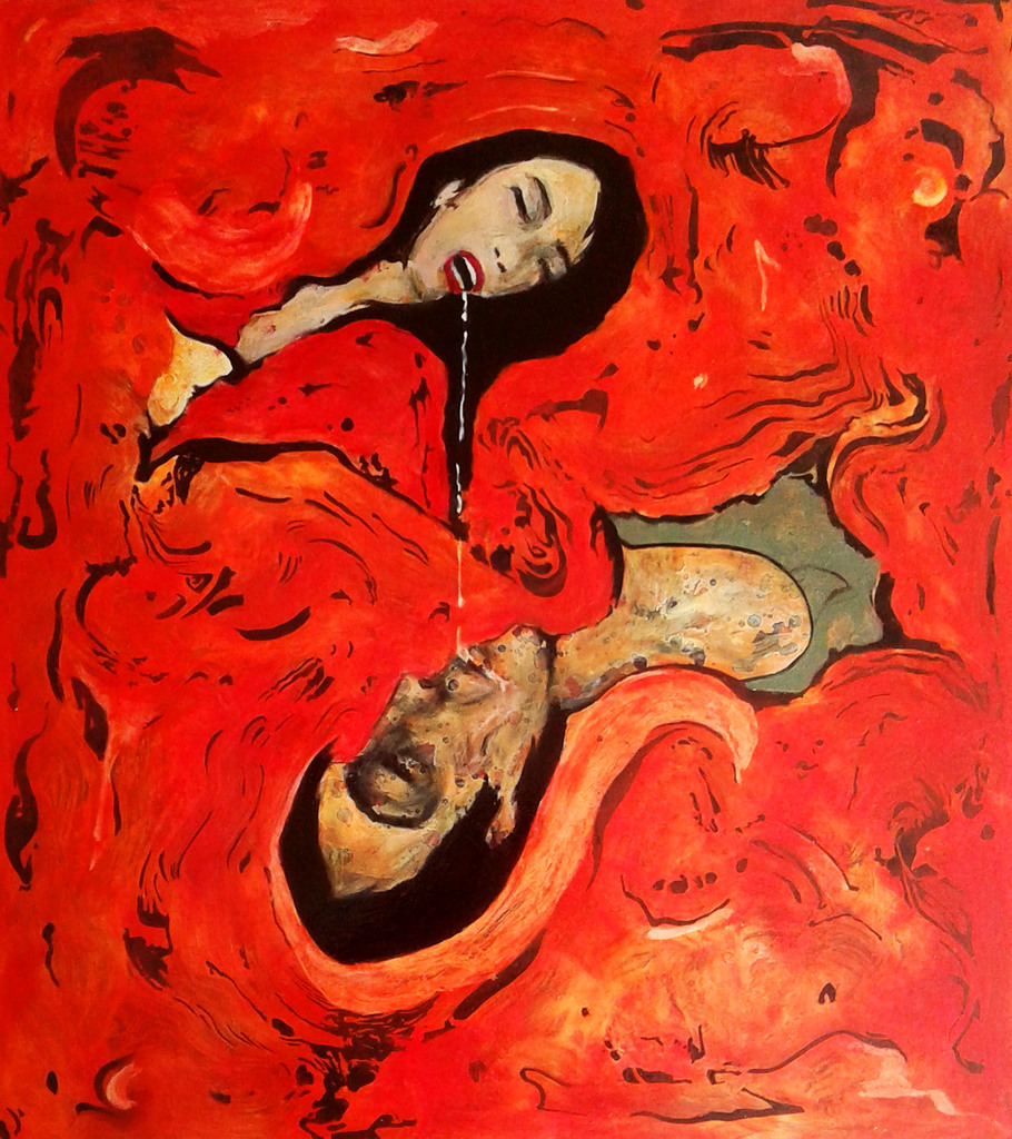 This painting is called 'Lovers Spit V2.0'. We see two figures engaged in an intimate situation. A sliver of saliva connects both figures. The warm red increases the sensual scene representing the intimate process of love, deep emotions and not to forget, absolute trust