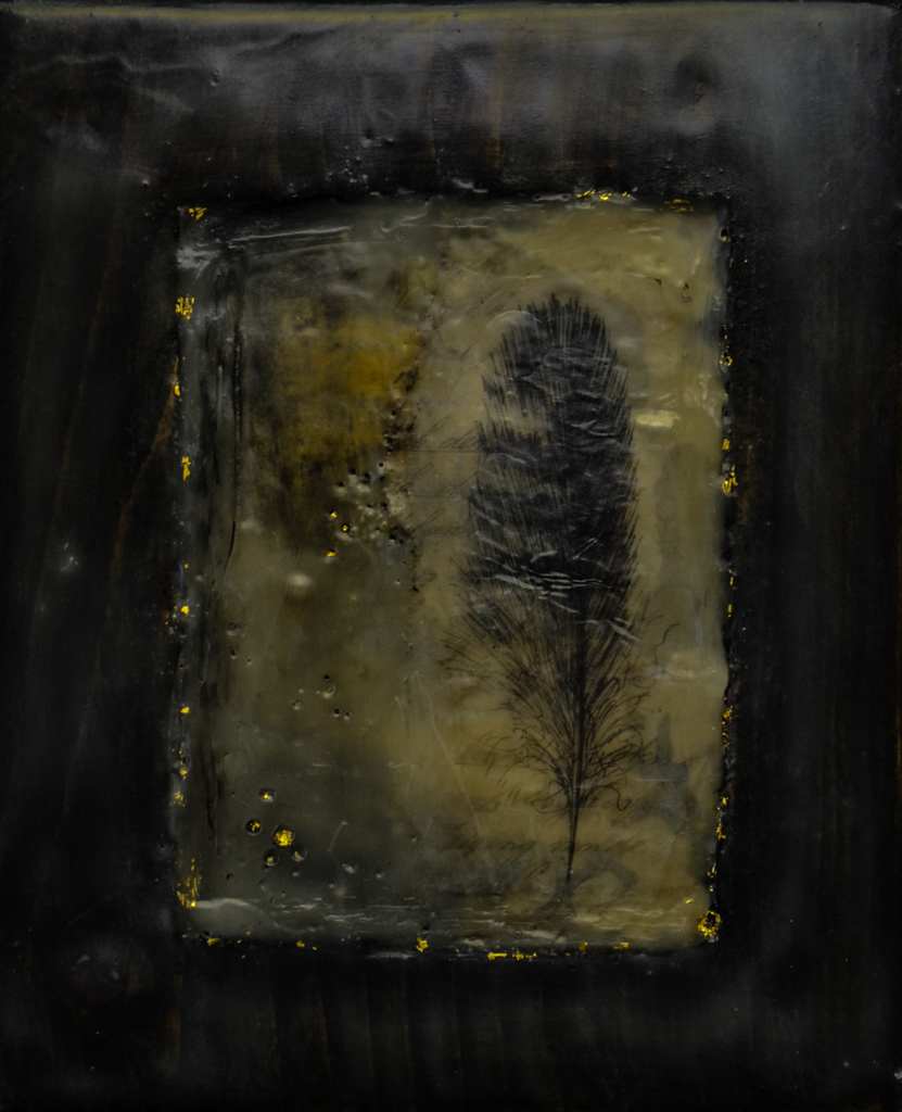 Licht veertje in zwaar blok hout met details in bladgoud