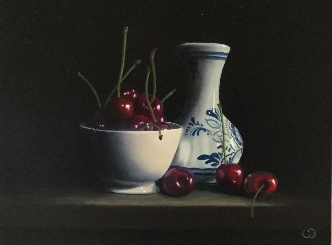 Kersjes in een oud kommetje en een delfts blauw vaasje.