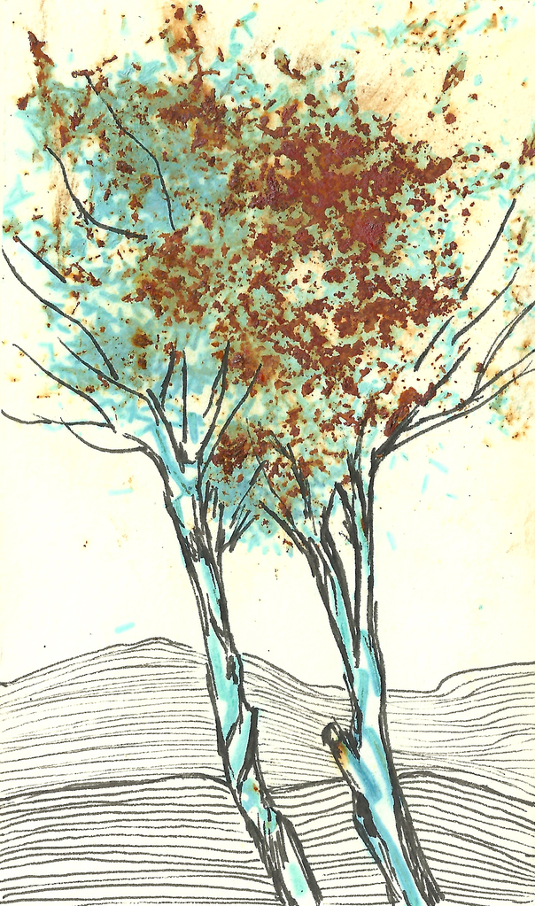Bomen, getekend met inkt, roest en geoxideerd koper.