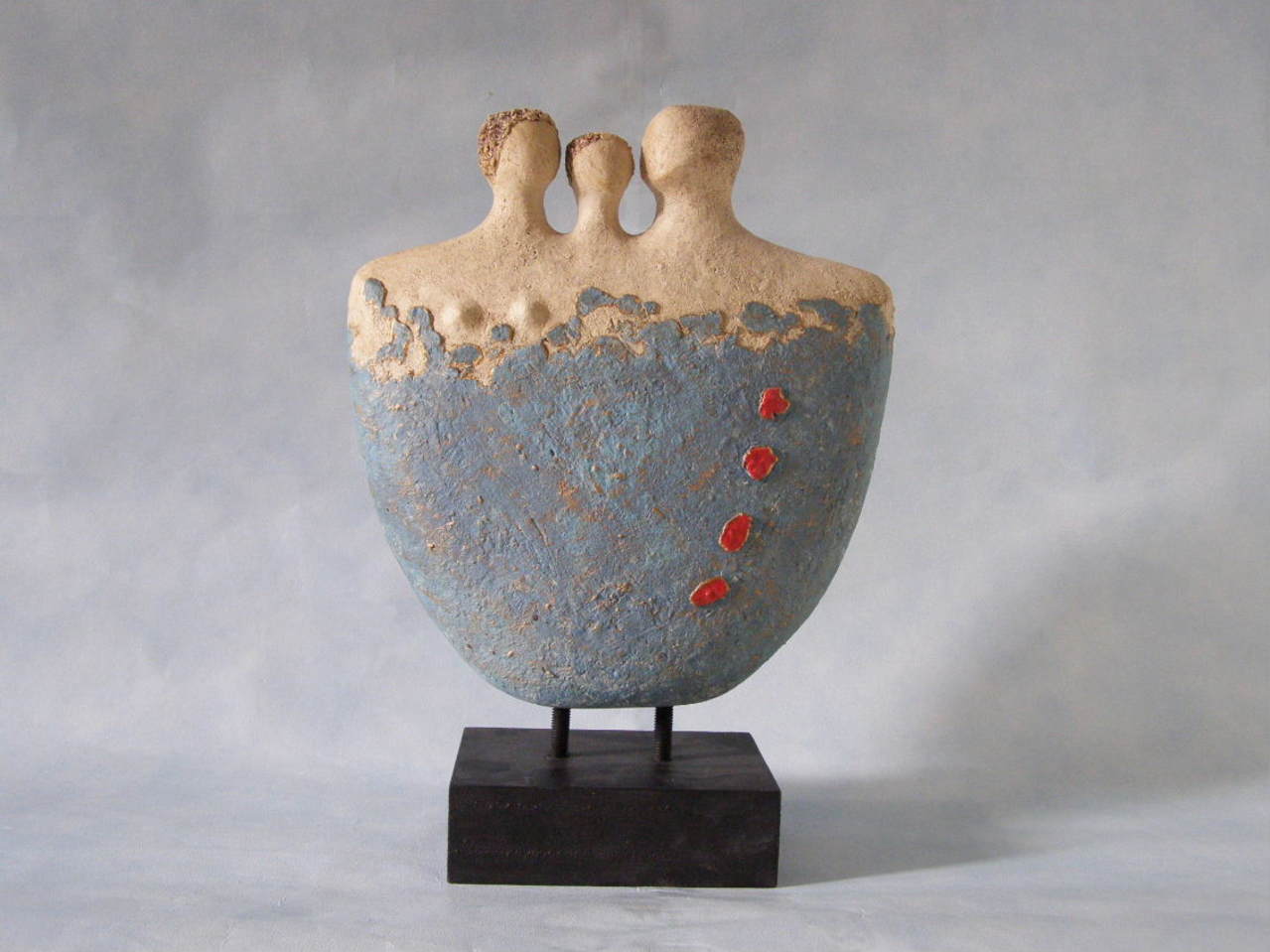 Gezin in één strakke vorm gevat. Op houten sokkel. Gemaakt van witte steengoedklei, bewerkt met ijzeroxide en gedecoreerd met gekleurde kleislibs en goud verf. Ook geschikt voor buiten.
