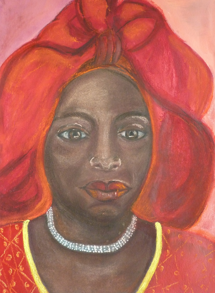 VROUW IN ROOD UIT GAMBIA PASTEL EN ACRYL MET PASSE PARTOUT EN LIJST 60 CM HOOG 50 CM BREED