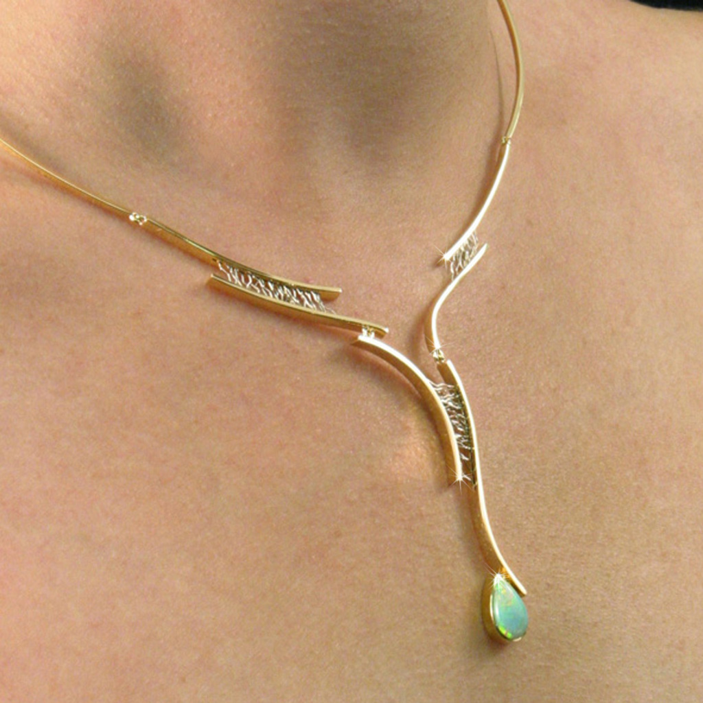 Je leeft je leven en volgd je pad. Hiervoor heb je relaties en vriendschappen nodig. Het pad is weergegeven met strakke lijnen, de relaties en banden die alles samen houden, zijn de levens lijnen. Fijne levensdraden die verbinden. Gemaakt uit geel- en witgoud, met een opaal.