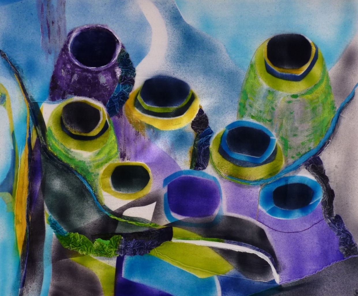 Dit werk is geschilderd en gespoten op zijdefluweel en geÏnspireerd op de vlakte der kruiken in Laos.