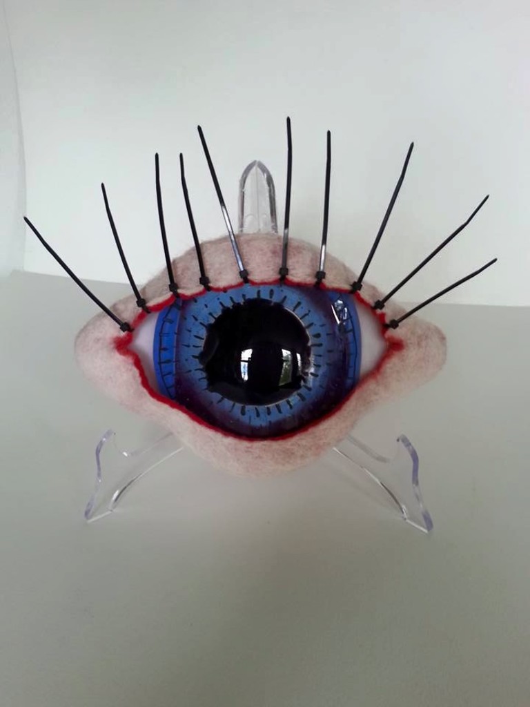 Blauwe glazen oog met vilten ooglid en wimpers met tiewraps op standaard.