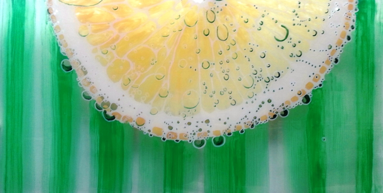 Schilderij voorstellend een gin en tonic glas. Acryl verf achter polycarbonaat.