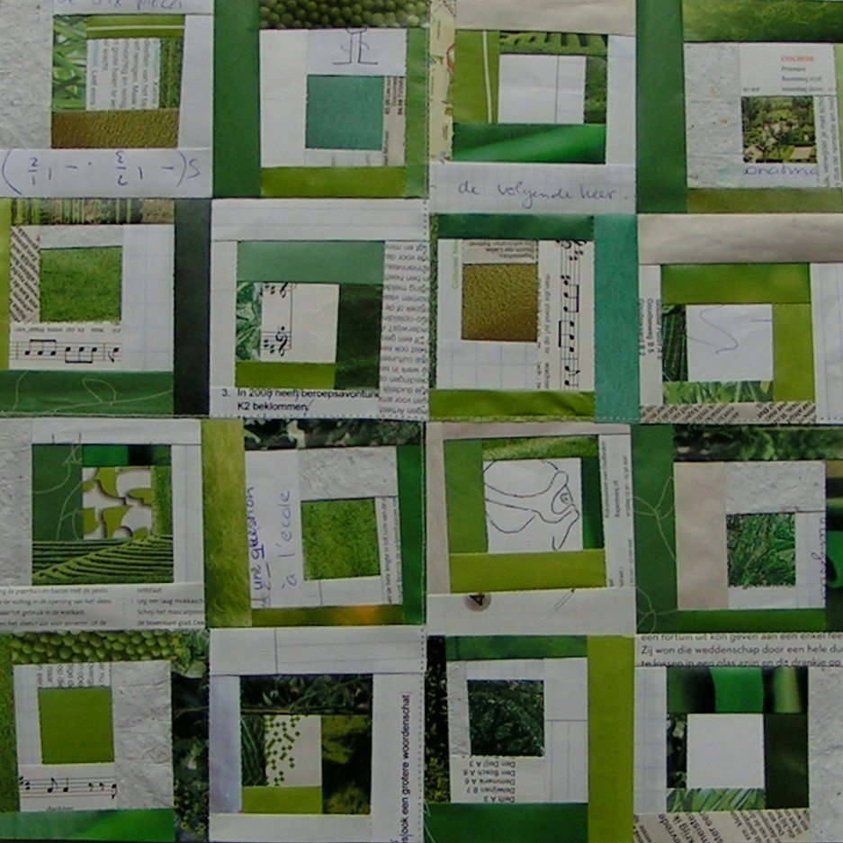 Collage, delen aan elkaar gestikt. Te combineren met de andere gekleurde Snippers, zie voorbeeld bij c.v. kunstenaar.