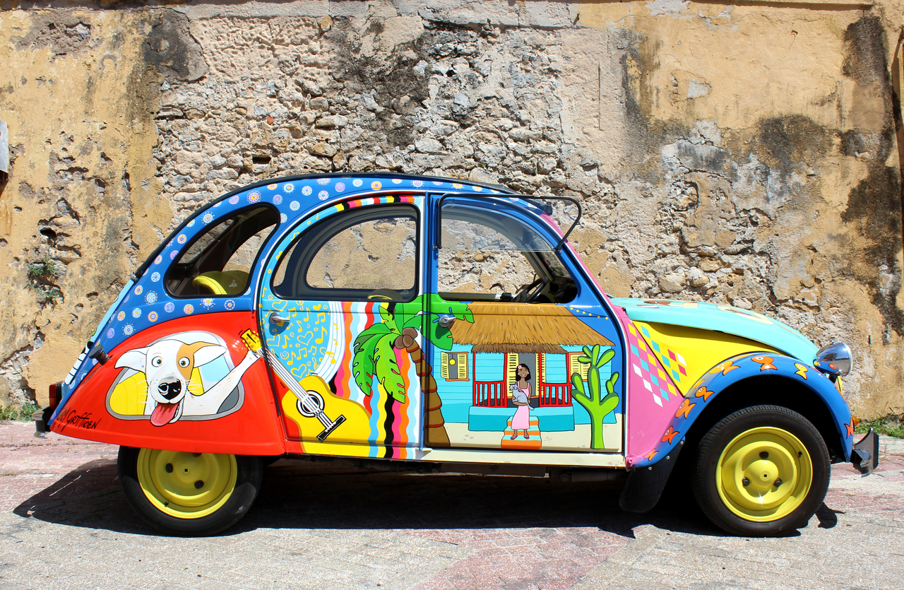 Kleurrijke auto in Curacao, vrolijke kleuren was mijn uitgangspunt, dat is niet zo moeilijk als je inspiratie zoekt op Curacao. Op deze eend heb ik mijn eigen hondje Kiki geschilderd met een gitaar palmbomen en een kunukuhuisje. Dit is nou echt een feestje om in te zitten en rond te rijden over dit paradijselijke eiland.