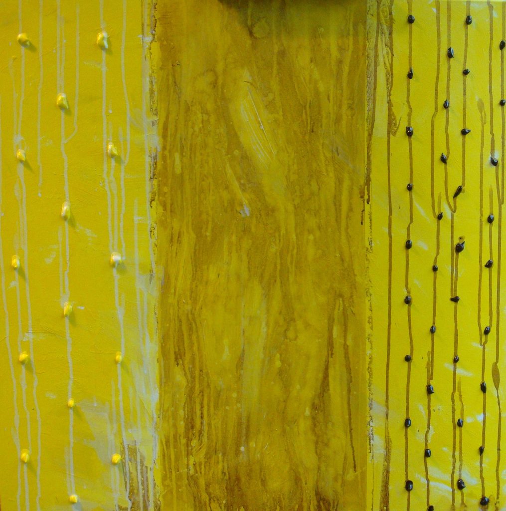 Geel abstract schilderij met acryl, medium en bister op doek.