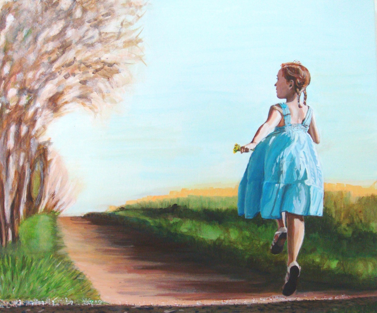 Schilderij van huppelend meisje met paardebloem in Limburgs landschap. Mixed media op doek.
