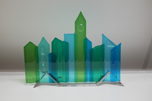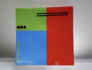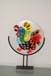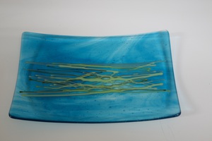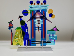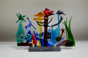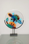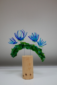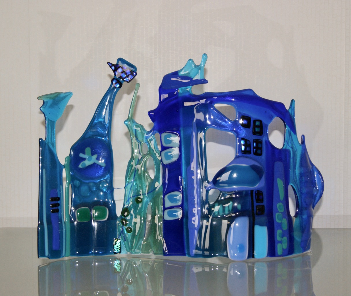 Techniek glasfusen. Blauw transparant glas, enkele details diochric glas. Blijft zelfstandig staan, slingervorm.