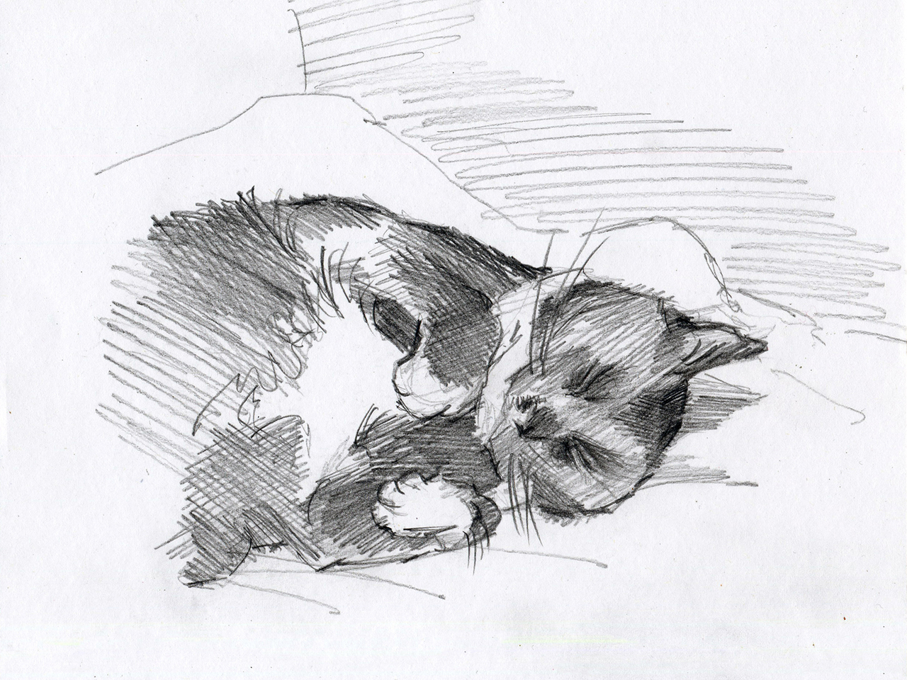 Enkel wie katten als gezel heeft, weet dat die de meest bizarre slaaphoudingen kunnen aannemen... - Potlood in schetsblok - Paradoxaal model: Trippel.