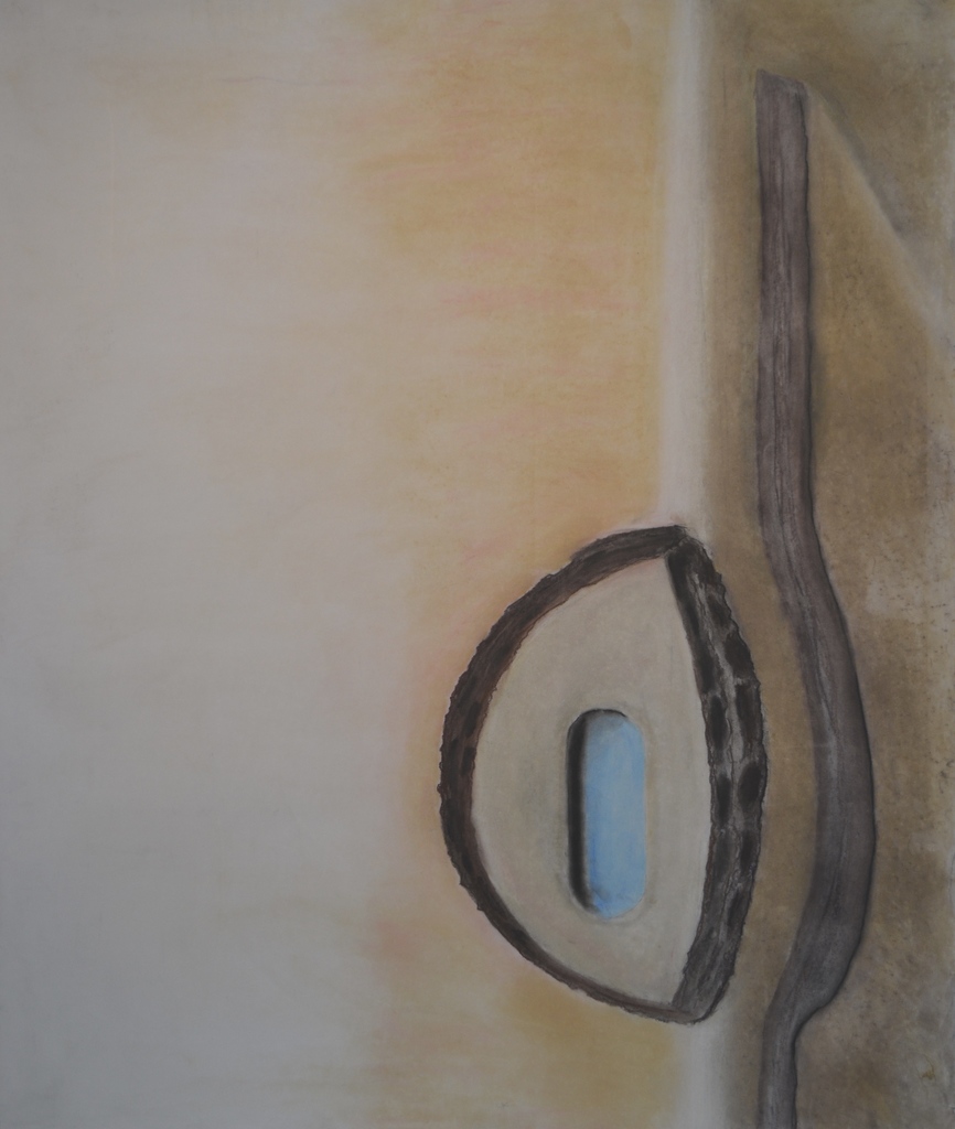 Karton 4 Doorkijkje bananendoos Karton heeft iets kwetsbaars, iets bloots. Het doet me denken een de menselijke huid met een link naar het erotische. Niet erotisch in de sfeer van het platte pornografische, maar aan de kant van het onschuldige, onbedoelde, een kant die me raakt en die ik probeer over te brengen. Het kwetsbare wordt nog versterkt door het gebruik van houtskool en pastel op papier.
