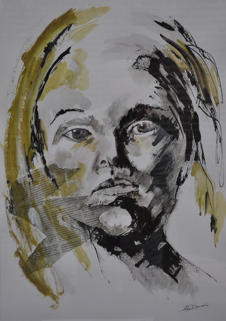 portret in mixed media gemaakt in oostindische inkt, bister, acrylverf en krantenpapier