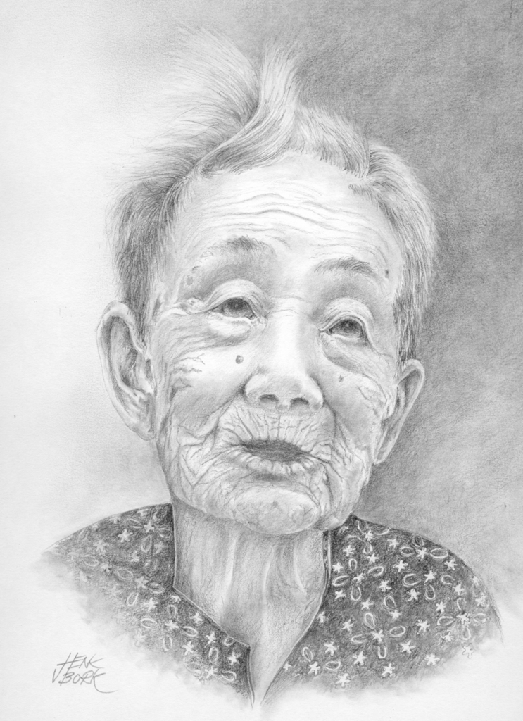 Oude Vietnamese vrouw leende zich prachtig voor deze portret tekening