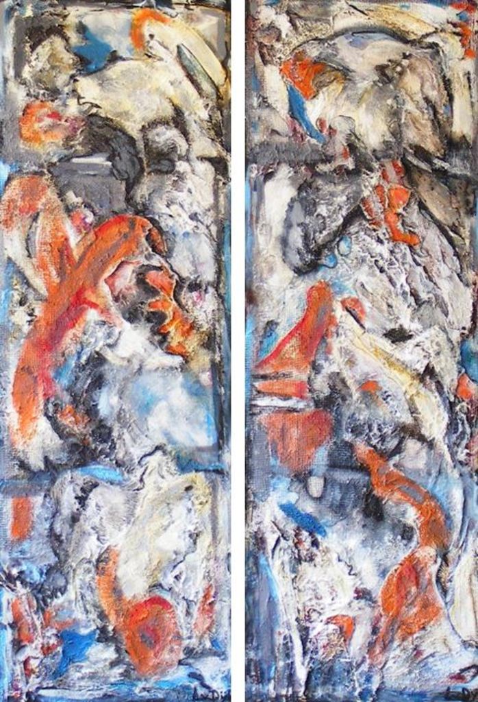 Iets in de buitenwereld intrigeert mij en door deze impressie uit te werken wordt zij blijvend deel van mijn binnenwereld. Laag na laag bouw ik aan de uiteindelijke vorm. Tijdens het werken komt er een stroom van associaties op gang. Het is een constant zoeken naar evenwicht tussen de verf en de andere materialen.