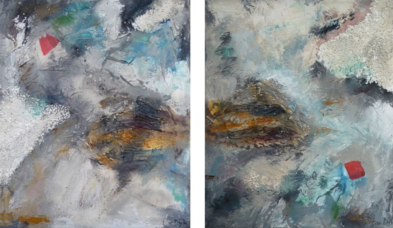 Iets in de buitenwereld intrigeert mij en door deze impressie uit te werken wordt zij blijvend deel van mijn binnenwereld. Laag na laag bouw ik aan de uiteindelijke vorm. Tijdens het werken komt er een stroom van associaties op gang. Het is een constant zoeken naar evenwicht tussen de verf en de andere materialen.