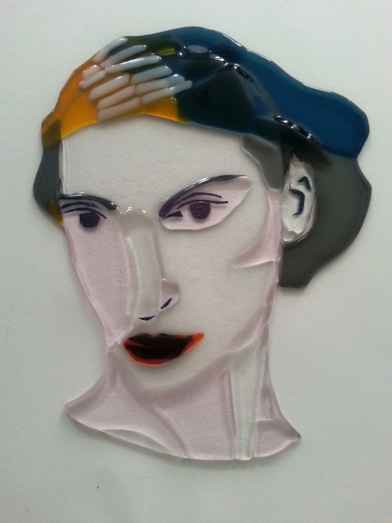 Glas portret van vrouw met blauw haar. Bullseyeglas met koper.