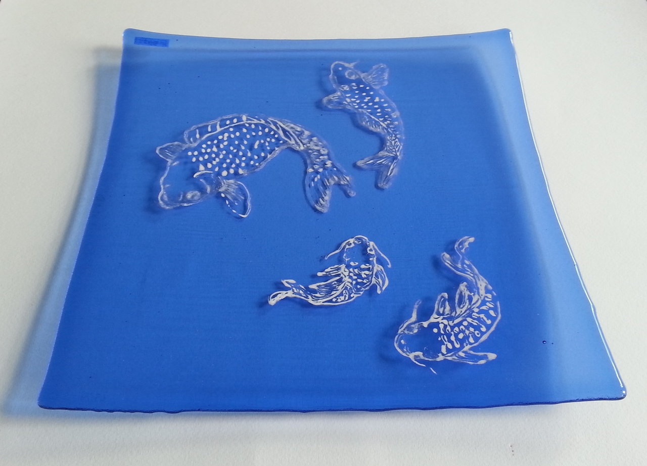Lichtblauwe vierkante glazen schaal met witte gebrandschilderde koikarpers in Bulsseyeglass.