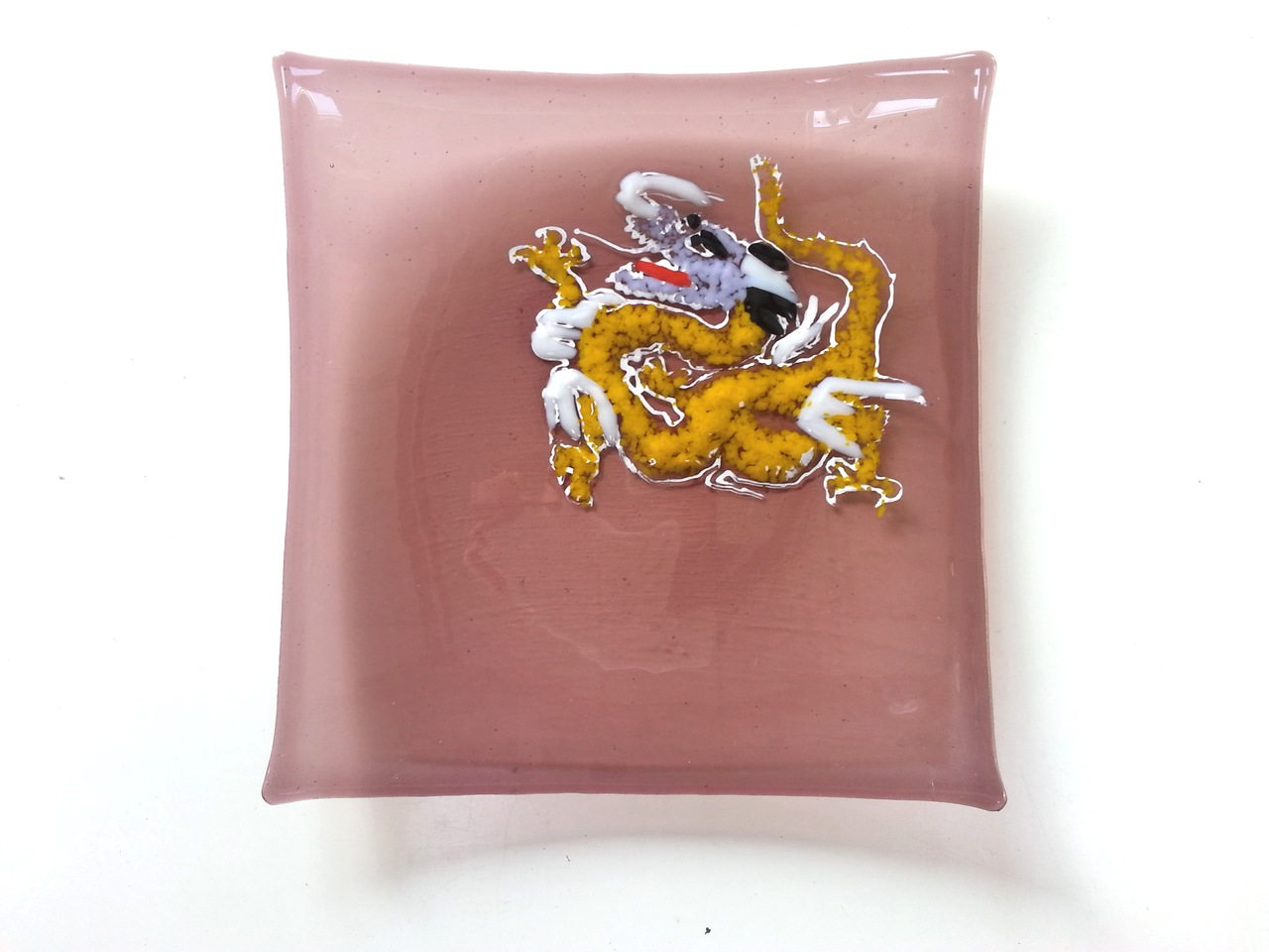 Pruimroze vierkanten glazen schaal met draak in Bullseyeglass tackfusion.