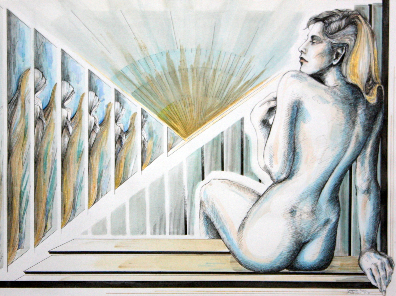 Pentekening Geaquarelleerd Zon Goud Vrouw Dag Nieuwe Ochtend Gesluierde-figuren Zittend-naakt